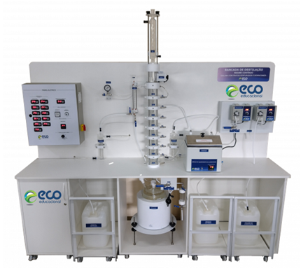 A COLUNA DE DESTILAÇÃO CONTÍNUA – Fracionada de Pratos com Recheios – Modelo Standard – PS (Painel elétrico Standard) é utilizada para estudos dos mecanismos nos processos de Destilação em uma coluna de pratos com recheios de anéis de Raschig, podendo ser operada em regimes de alimentação continua, batelada ou em condição estacionária, utilizando misturas binárias ou multicomponentes. O fato de a coluna ser transparente, possuir isolamento térmico a vácuo; pontos de retirada de amostras e de monitoramento da temperatura ao longo dela, facilita a visualização dos fenômenos fluidodinâmicos e as análises de equilíbrio das fases líquida e vapor da coluna.