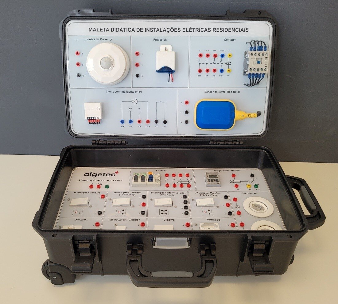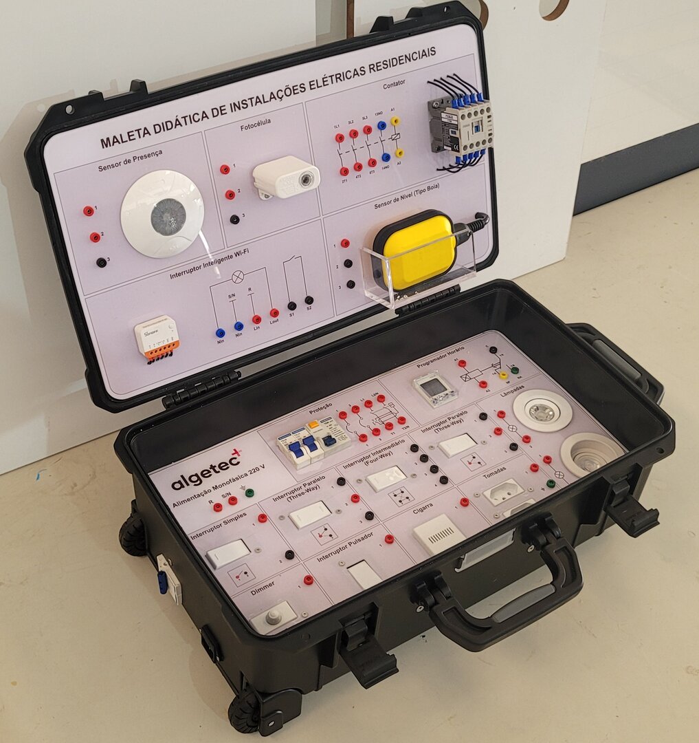 A Maleta de Instalações Elétricas Residenciais é um equipamento didático portátil para o ensino prático de conceitos de instalações elétricas. Com estrutura compacta e segura, permite simular circuitos reais, abordando temas como proteção, distribuição de energia, iluminação, automação e controle de luminosidade. Inclui diversos componentes e é indicada para cursos de Engenharia, técnicos em Eletrotécnica e Automação, formação de instaladores e disciplinas relacionadas, sendo ideal para instituições de ensino técnico e superior, inclusive em formatos híbridos.